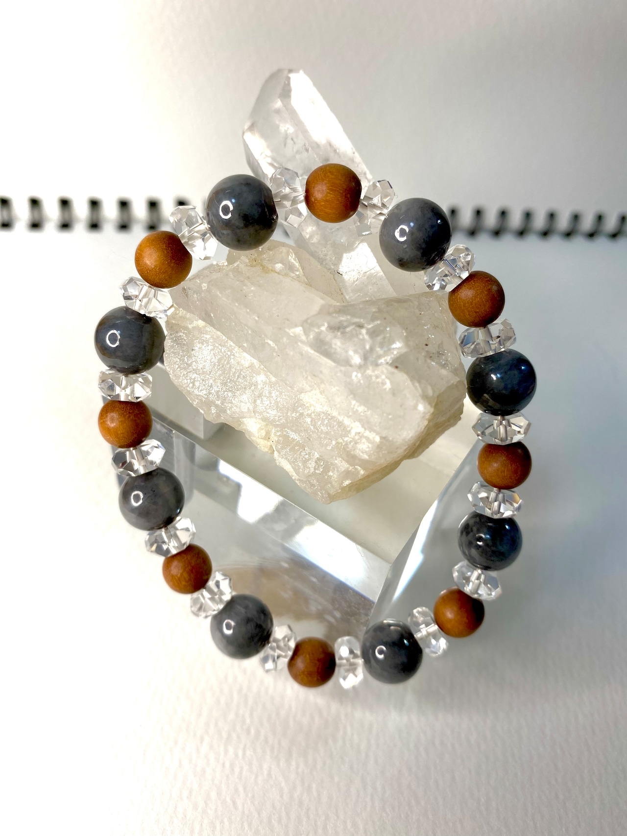 白檀の香りで癒し、翡翠と水晶の相性は抜群です。癒しのブレスレットです。