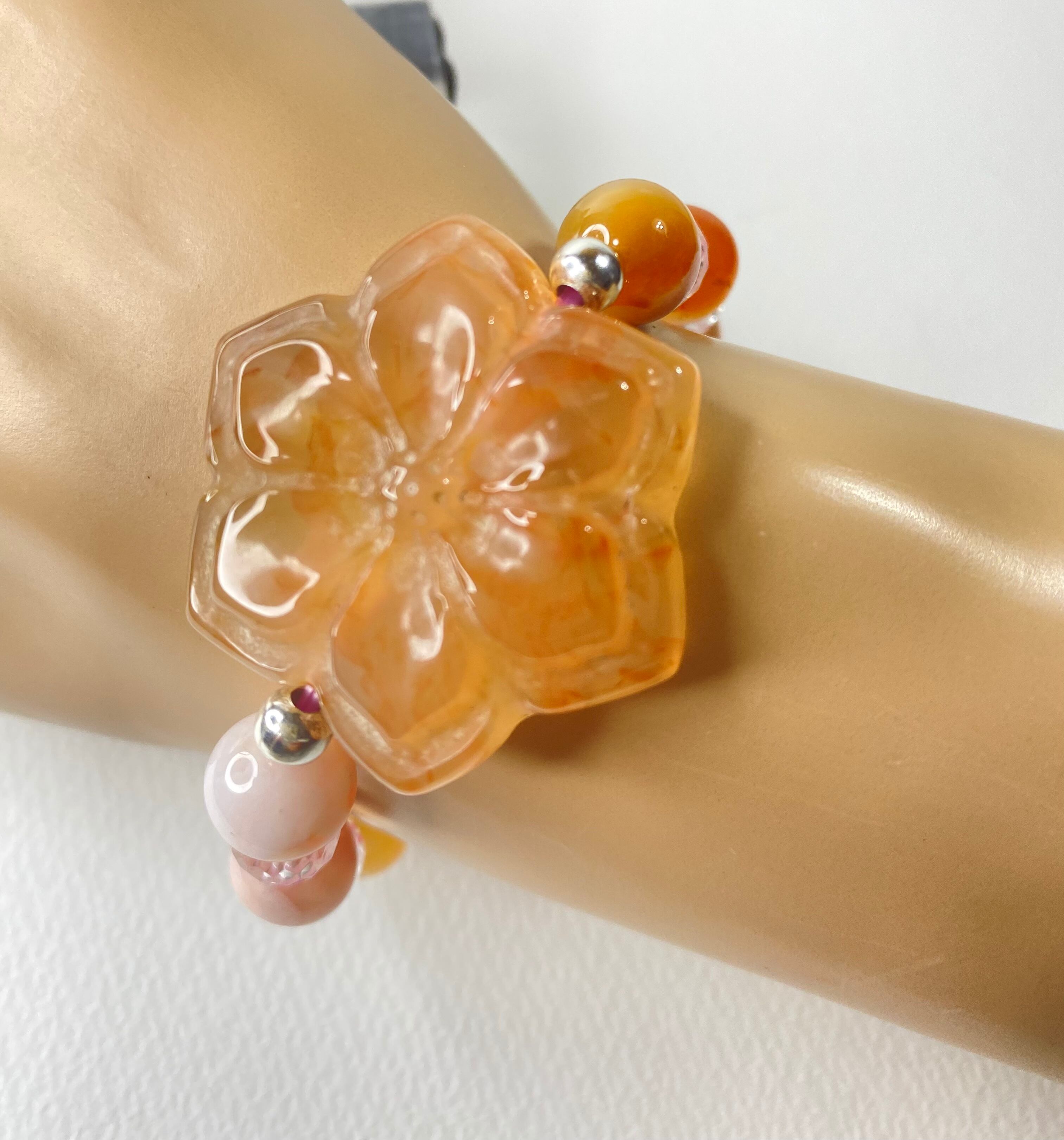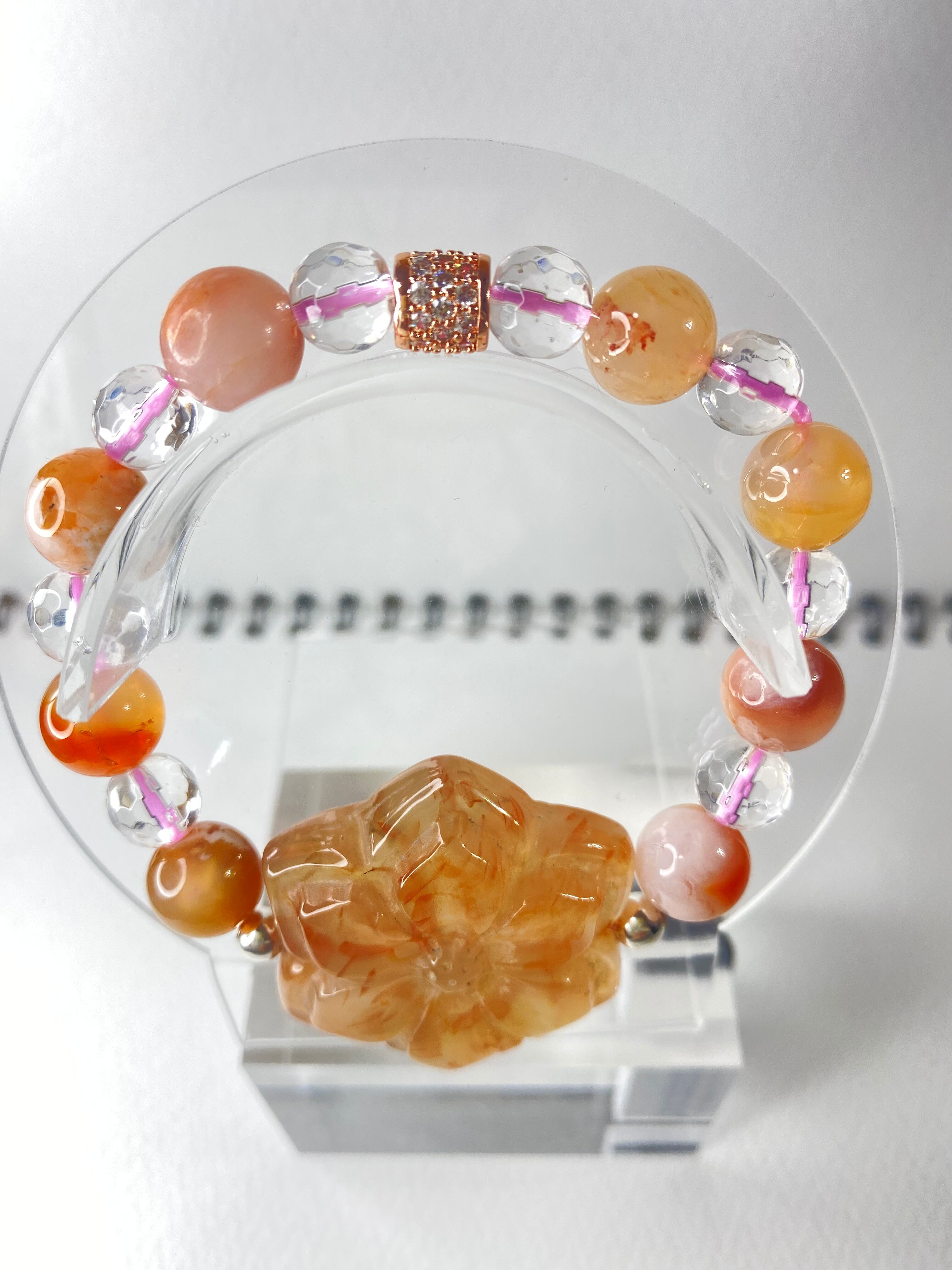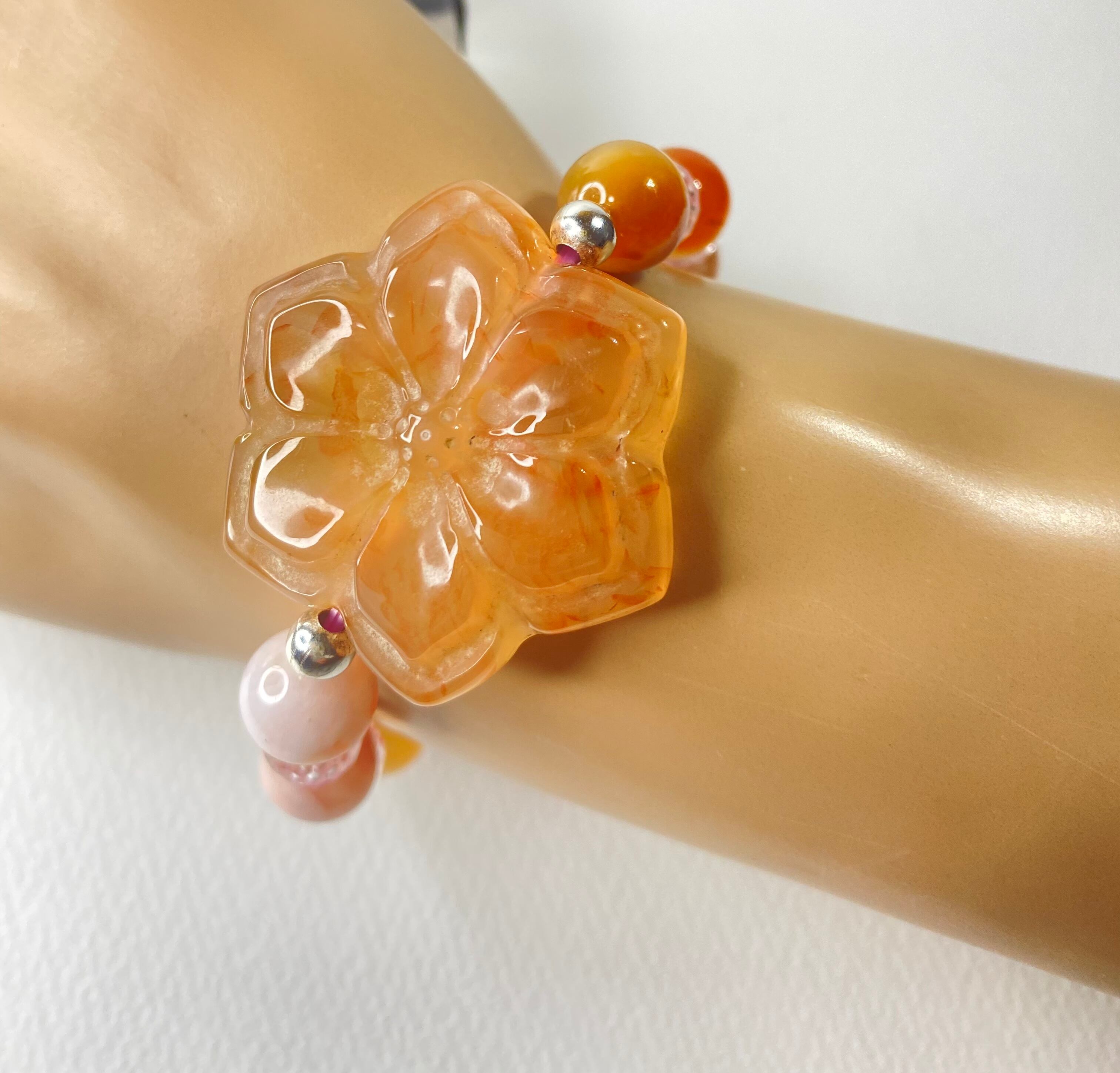 桜瑪瑙の牡丹の花の癒しのブレスレット。オレンジ系