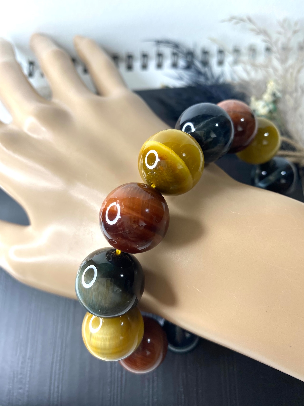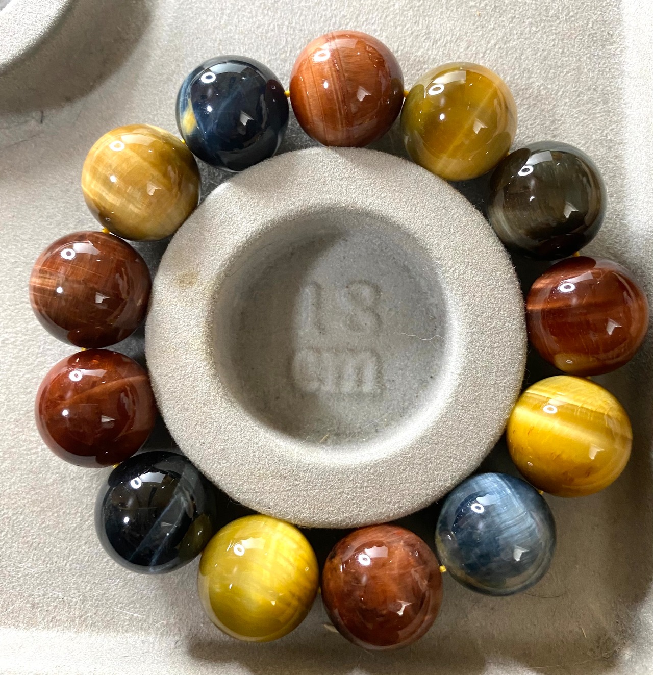 このタイガーアイにはカラーバリエーションがいくつかありますが、その中でも最もポピュラーな黄金と情熱的な赤色と知的な青色の三色を交互に配置した物を「ミックスタイガーアイ」と呼びます。またタイガーアイはこの光の筋が綺麗な物が質がいいとされています。